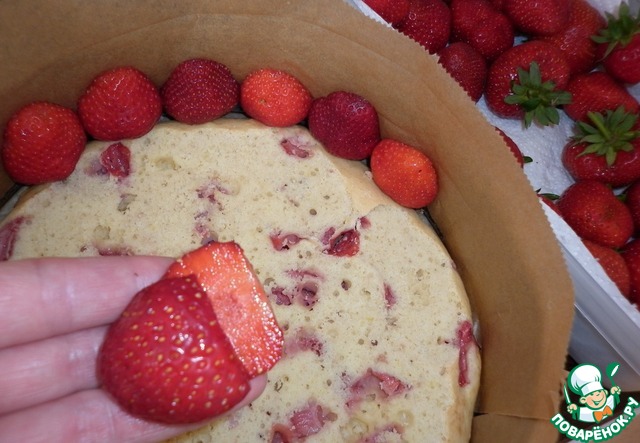 Собираем торт: в разъемную форму (я, для надёжности выстелила форму пергаментом) выкладываем корж (по желанию, срезать верхушку, если корж при выпекании поднялся неравномерно, как получилось у меня), затем, по бокам выкладываем разрезанную пополам клубнику, предварительно срезав плодоножку, разрезом наружу (по возможности, подобрать ягоды более-менее одинакового размера).