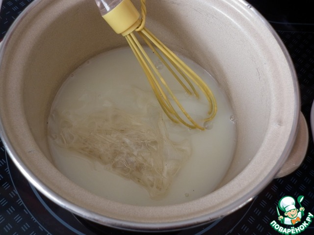 Сахар растворить в молоке на небольшом огне, добавить отжатый желатин. Постоянно помешивать до полного растворения желатина.