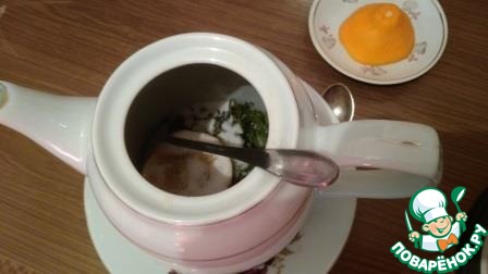 Поставить воду в чайник и довести до кипения. Тем временем в заварочный чайник насыпать зеленый чай, добавить лимон, порванные руками чистые листочки мяты, сахар и все хорошо помять ложкой.