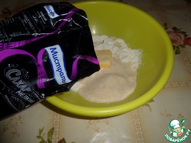В чашку просеиваем муку, добавляем щепотку соли, разрыхлитель теста, сливочное масло. Добавляем сахар. Я использовала сахар "Мелкий тростниковый" ТМ "Мистраль". С помощью вилки перетираем все ингредиенты в крошку.