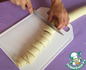 Раскатать пласт толщиной 0,5-0,8 см прямоугольной формы. Нанести равномерно начинку и закрутить в рулет.