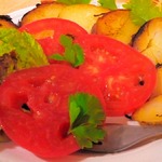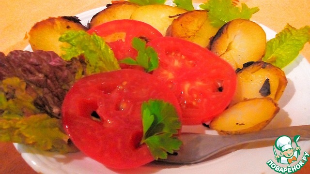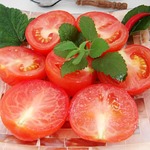 Берём твёрдые спелые помидоры, моем. Если мелкие, то накалываем зубочисткой, если крупные, то режем пополам и кладём сверху зелени.