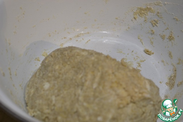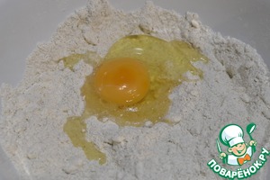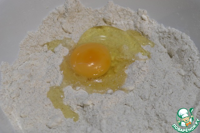Просеиваем два вида муки, добавляем соль, сахар, быстро рубим с маслом в мелкую крошку, добавляем молоко и яйцо