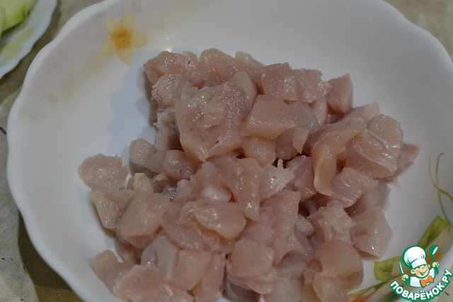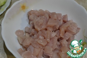 Режем филе мелкими кусочками, солим, перчим смесью перцев