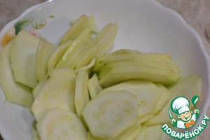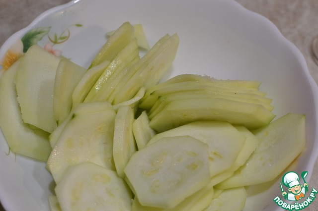 Очищаем кабачок от шкурки, режем тоненькими кружочками, слегка солим, посыпаем универсальной приправой