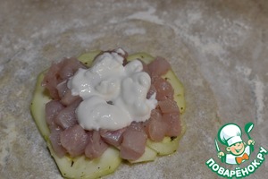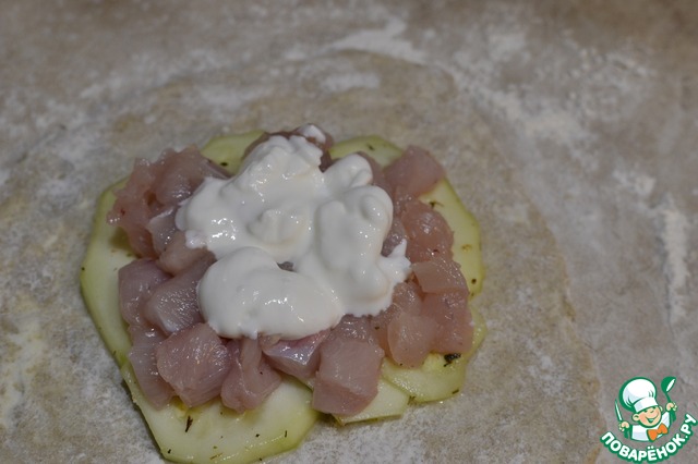 Укладываем лепешки на предварительно застланный промасленной бумагой для выпечки противень. Выкладываем по центру начинку- 2 слоя кабачков, курица, по 2 ч. л. без горки сметаны