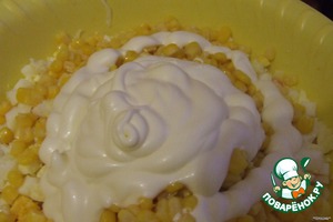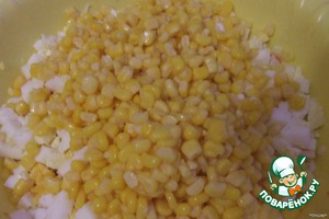 Все ингредиенты выкладываем в глубокую миску и добавляем кукурузу.