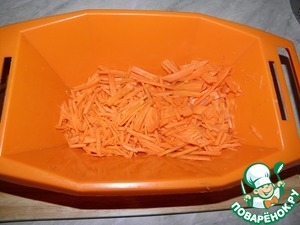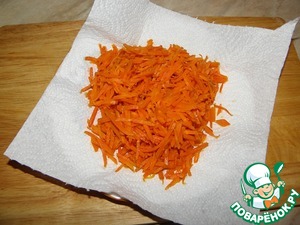 Морковь нашинковать тонкой соломкой, или натереть на терке для корейской моркови