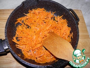 В эту же сковороду, (где жарились грибы с луком) добавить еще каплю масла, обжарить морковь
