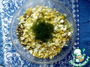 Яйца тоже нарезаем мелким кубиком, а можно и на тёрке потереть...