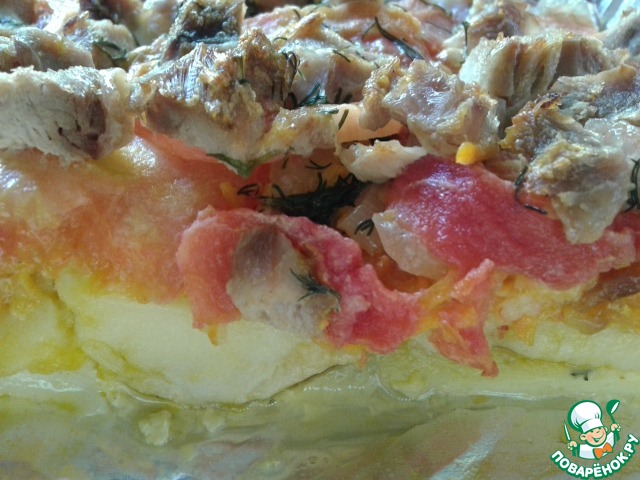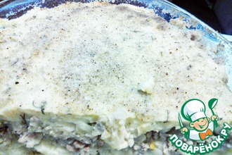 Яйца вибить в отдельную тарелку, добавить соль, перец по вкусу и мелко порезаную зелень петрушки и укропа. Взбить как на омлет и залить сверху все наши слои. Выпекать 25-30 минут в разогретой до 180" С духовке.