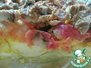 4 слой : нарезанная слайсами телятина (я резала кубиками, так как у меня ребенку так более удобно кушать) -
