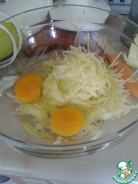 Добавить теплое молочко, что б картошка не потемнела и яйца. Добавить мелко нарезанную зелень, посолить и поперчить по вкусу. Жарить на разогретой сковороде до золотистого цвета на растительном масле