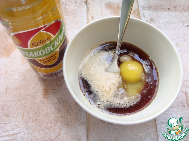 Наливаем квас, гасим в нём соду, разбиваем яйцо, солим и вилкой всё перемешиваем. -