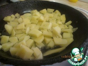 Картофель нарезать мелкими кубиками и обжарить до хрустящей корочки.
