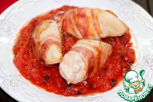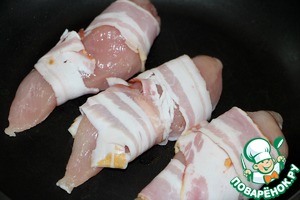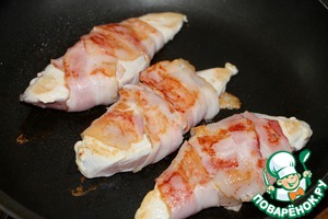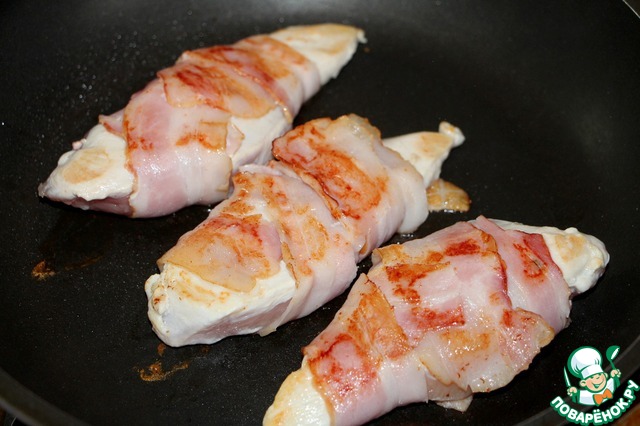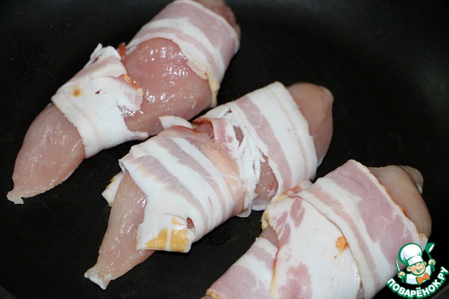 Филе зачистить от пленок и каждое разрезать пополам вдоль на 2 части. Посолить и поперчить. Завернуть каждое филе в бекон ( в одну или две полоски на каждое филе)