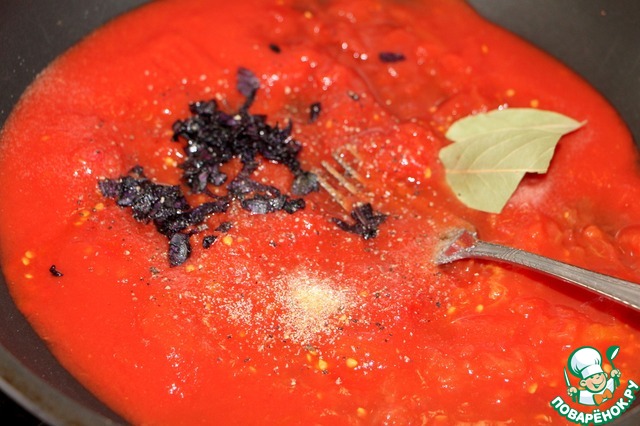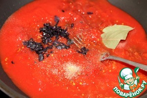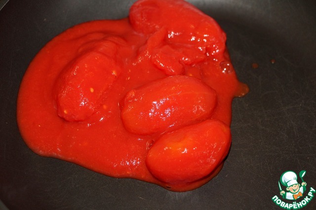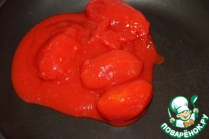Для соуса в сковороде аккуратно размять вилкой томаты в собственном соку, чтобы кусочки помидоров остались.