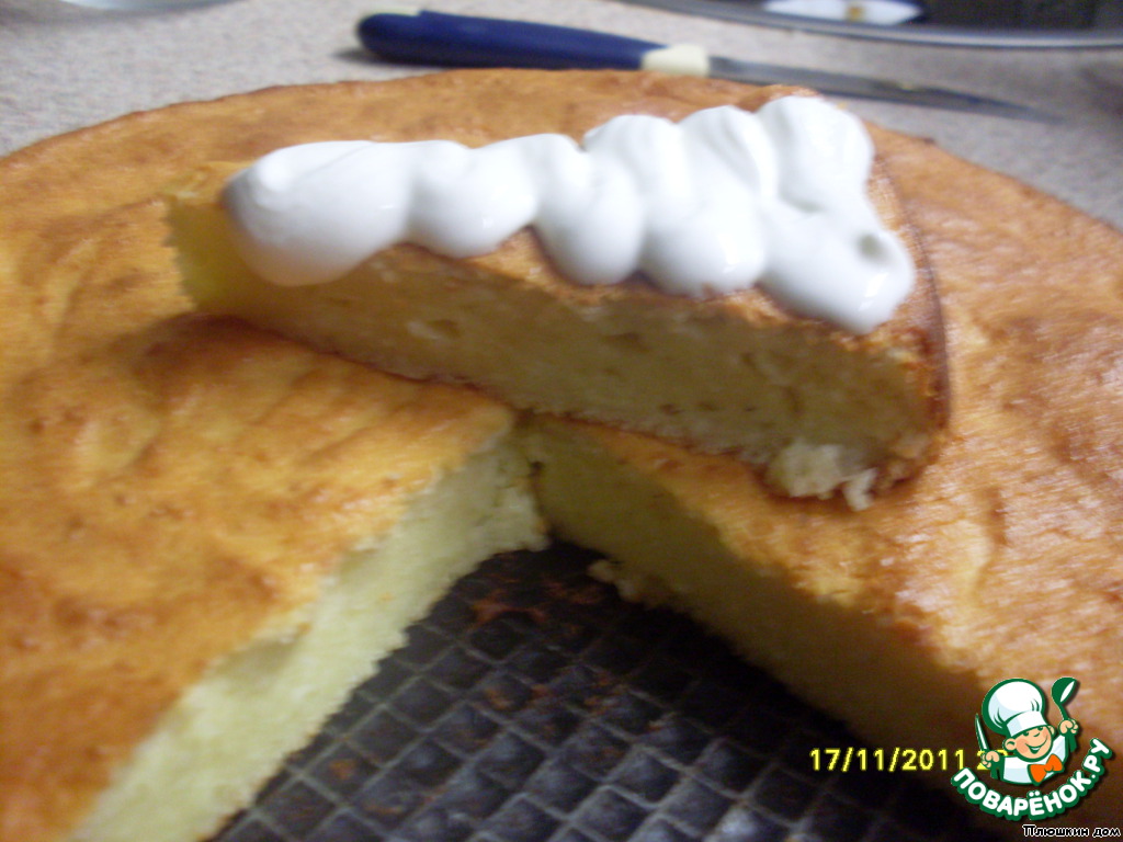 Взбить творог, желтки, сахар, ванильный сахар. Добавить подтопленное масло, взбивая. Добавить манную крупу, взбивая. Добавить погашенную лимонным соком соду и лимонный сок 1 /2 лимона (можно и цедру тоже), взбивая. Влить взбитые белки, взбивая. Тесто должно получиться консистенции густой сметаны. Корректировать густоту теста можно молоком и манкой.
