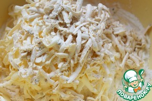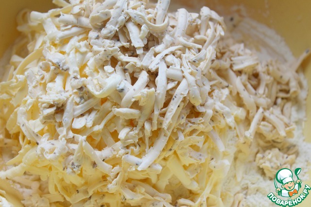 • Муку просеять, на нее натереть на терке плавленный сырок и масло.