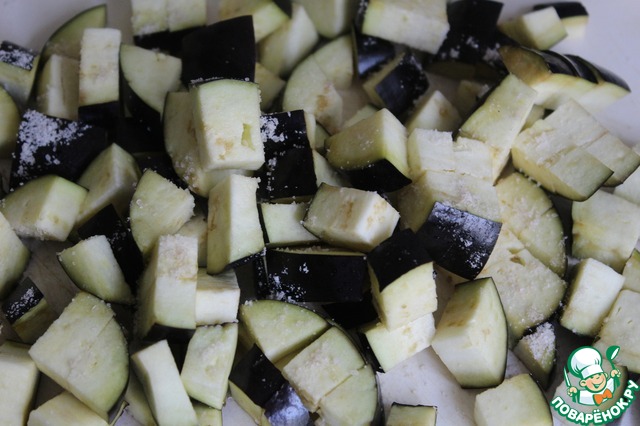 • Баклажаны порезать кубиком, посолить, отставить на 15 мин, отжать и быстро обжарить на растительном масле.