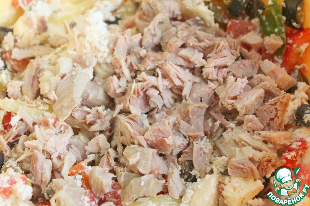 • В емкость сложить баклажаны, помидоры, творог, порезанную моцареллу, перец, порезанный сломкой, порезанное мясо индейки, добавить специи, прованские травы и перемешать.