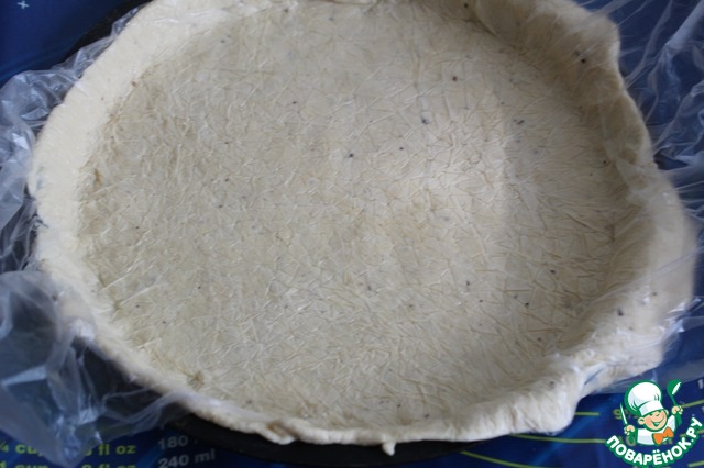 • Снять верхнюю пленку, перевернуть тесто на форму для киша пленкой вверх, снять пленку, излишки теста срезать.