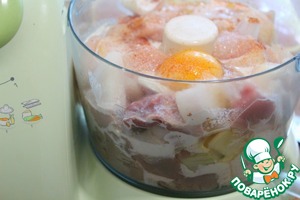 Складываем в блендер печень, мясо, лук, добавляем специи, вливаем сливки и яйца, пробиваем до однородной массы.