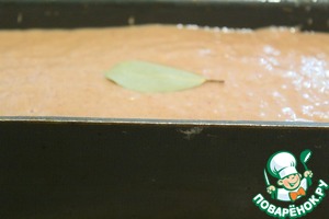 Смазываем форму растительным маслом и выкладываем паштет, сверху кладем лавровый лист.