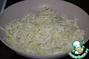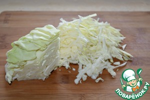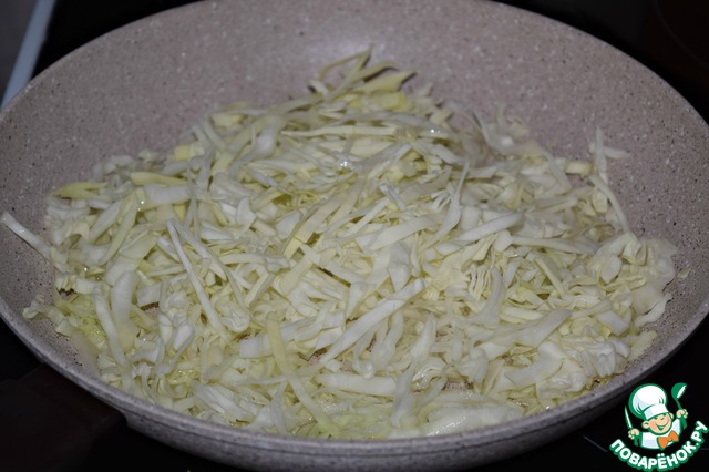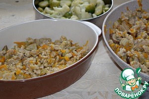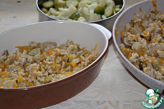 Все подготовленне ингредиенты выложить в форму для запекания в следующем порядке:белокочанная капуста, затем фарш с овощами.