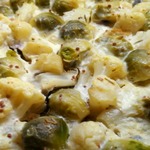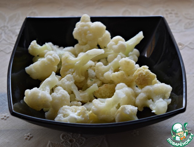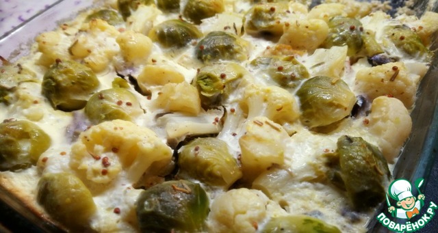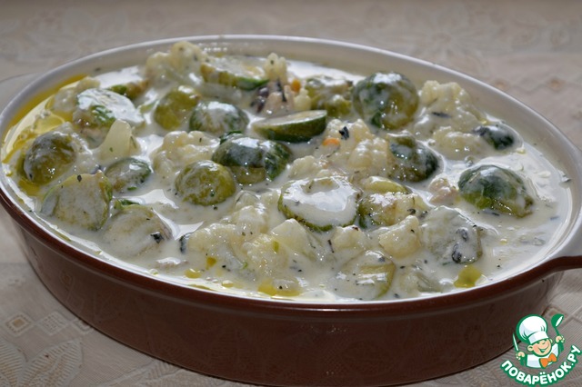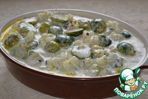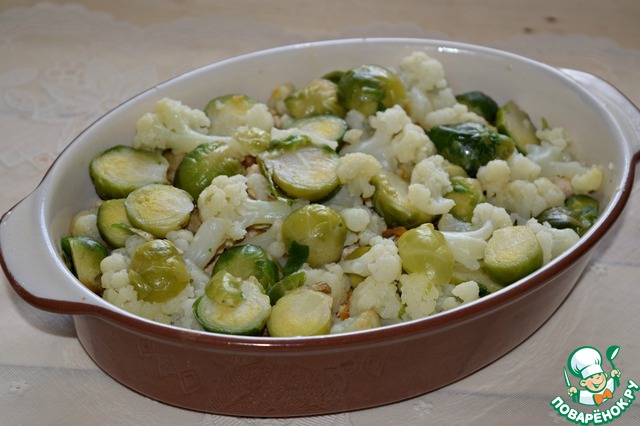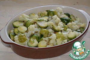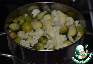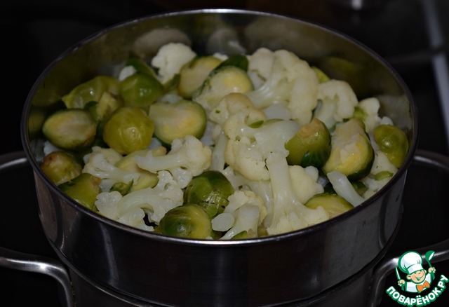 Отварить цветную и брюссельскую капусту в кипящей, хорошо подсолённой воде минуты 3-4, не дольше.
