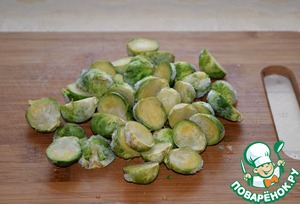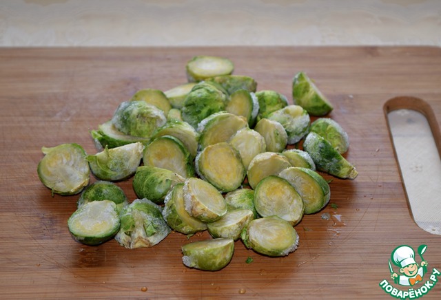 Брюссельскую капусту слегка разморозить и разрезать пополам.