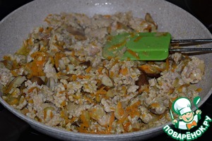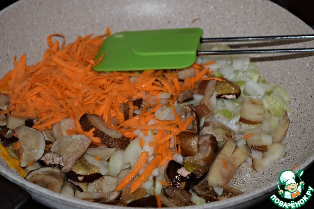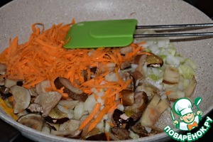 Лук, морковь и грибы жарить на растительном масле до мягкости.