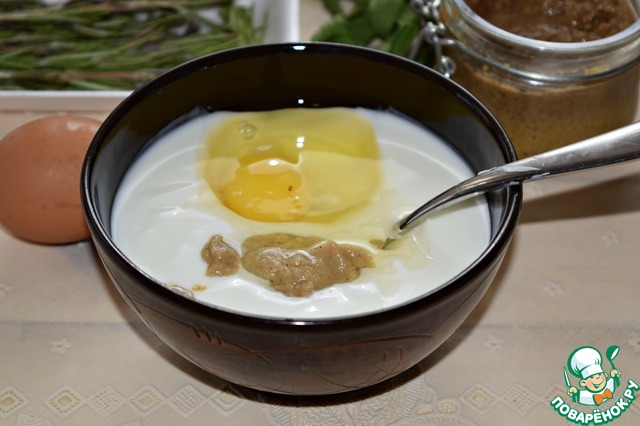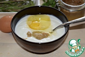 Для соуса взбить яйца с йогуртом и горчицей. Добавить мяту и розмарин. Посолить, поперчить.