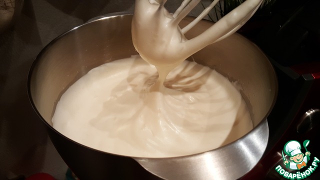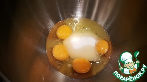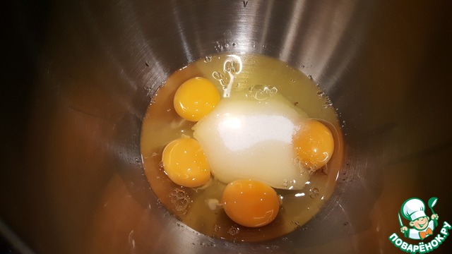 Яйца взбить с щепоткой соли и сахаром до полного растворения сахара и значительного увеличения в объёме.