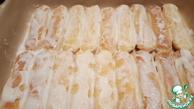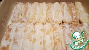 В мою форму поместилось 18 печенек и ушла баночка йогурта. При отсутствии йогурта, можно на дно формы выложить небольшую часть творожной смеси и сверху выложить печенье.