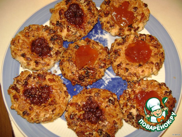 Выпекать 20 минут при температуре 150 градусов. Вынуть из духовки, еще раз вдавить серединки. Разложить в них по 1/2 чайной ложки варенья. Не снимать печенье с противня пока оно не остынет.