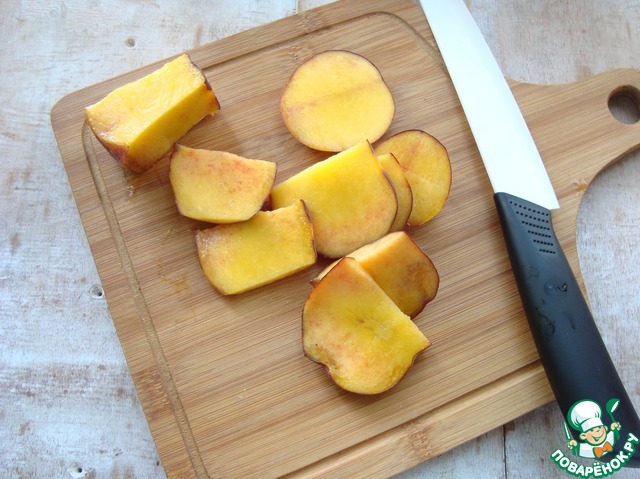 Персик режем произвольно кусками, чтобы они поместились в "кармашки".