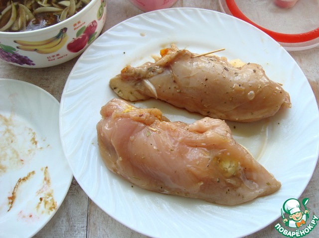 Каждую половину надрезала в виде кармашка, не разрезая с одной стороны. Куски можно отбить чуть, чтобы удобней заворачивать было, но я сегодня этого не сделала.