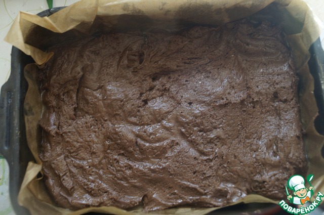Форму для выпечки застелить бумагой для выпечки, смазать тонким слоем масла и выложить шоколадное тесто, разровнять. -