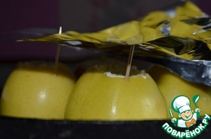 Сверху при помощи зубочисток прикрепить фольгу, так, чтобы она не касалась яблок.