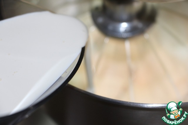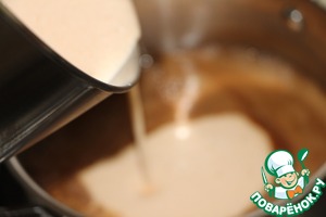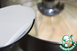 Не переставая взбивать, тонкой струйкой влить жирные сливки.