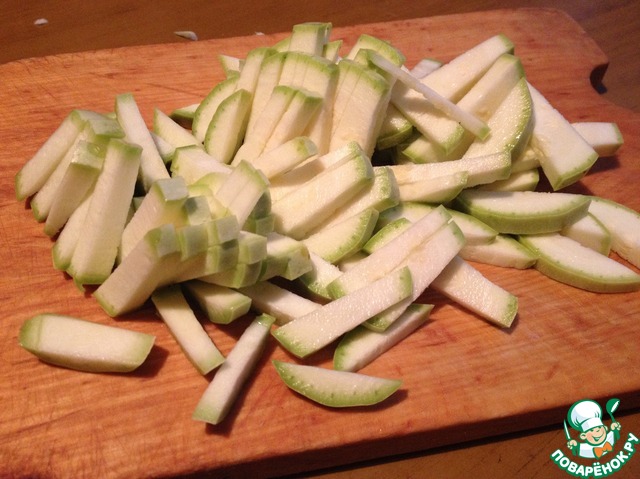 • Цукини (или молодой кабачок) вымыть, обсушить, нарезать брусочками по размеру пене.