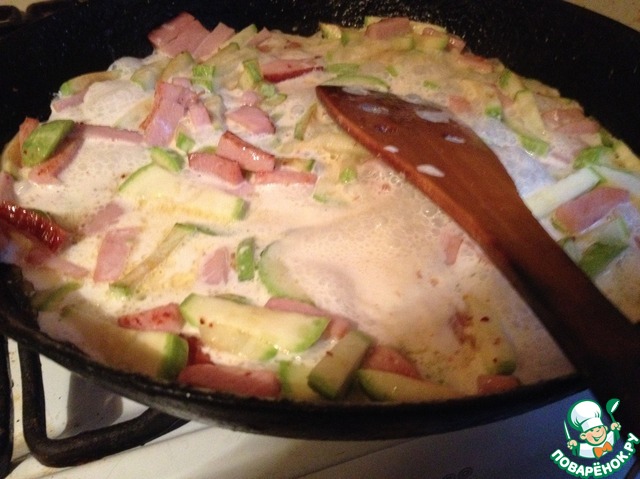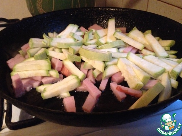 • В сотейнике разогреть оливковое масло. Обжарить ветчину. Добавить цукини и обжарить всё вместе.
