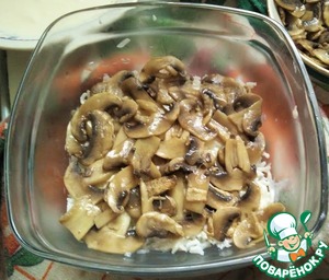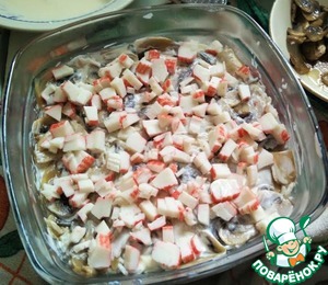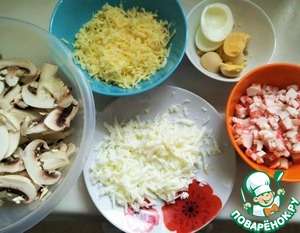 Отвариваем рис, яица, трем на терке сыр, белки. Желтки оставляем для украшения. Крабовые палочки мелко режем. Жарим шампиньонки.