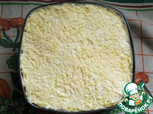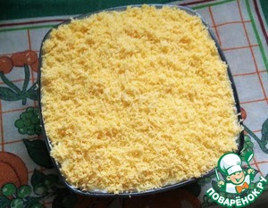 Когда основные 3 ингредиента закончились, кладем белки, промазываем заправкой/майонезом, то же повторяем с сыром. Сыр НЕ утрамбовываем! Девочки, солим по своему вкусу! С заправкой обращаемся так же, на своё усмотрение.