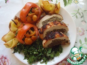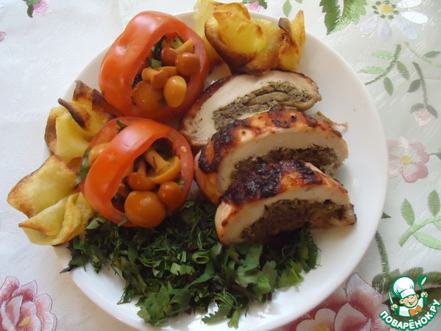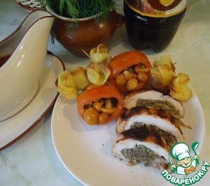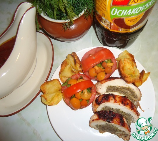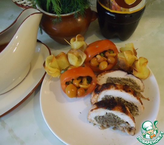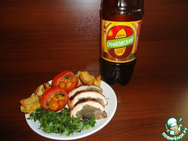 Угощайтесь, мои дорогие, куриным рулетом с грибами, тушеным в квасе под ягодным маринадом!