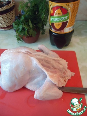 Курицу помыть, очистить от перышков и начать ее разделывать.