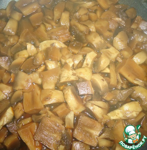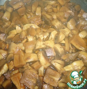 Благодаря тому, что грибы тушились, а не жарились начинка получилась очень сочная.