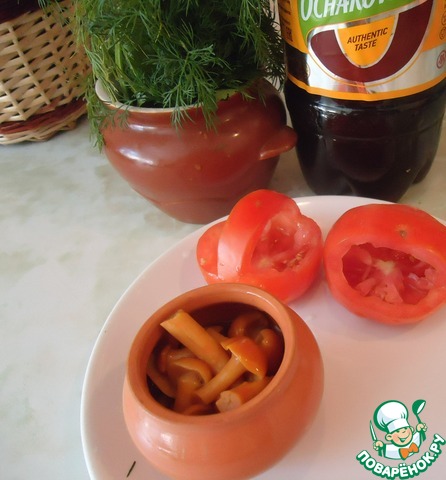 Наполняем их сначала зеленью, а затем маринованными грибами -
