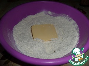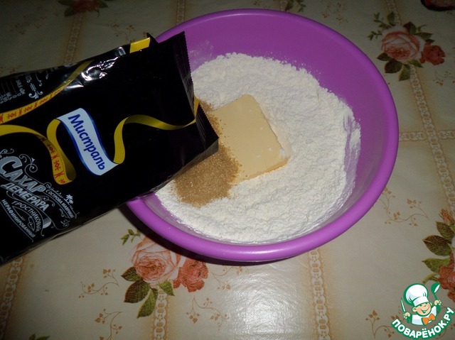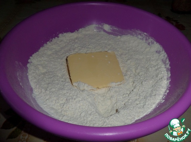 В чашку просеиваем муку, добавляем щепотку соли, разрыхлитель теста и сливочное масло.